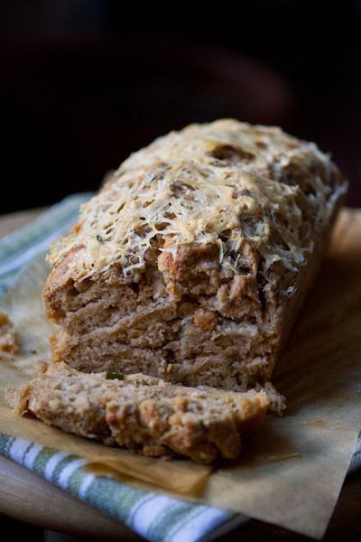 Transfer the batter to prepared pan. Pour the melted butter evenly over top of the dough. Bake about 30 minutes then scatter the remaining 1/4 cup of cheese over the top. Return the loaf to the oven and bake 15 to 20 minutes longer or until a tester inserted near the center comes out clean. Cool in the pan for 5 minutes.