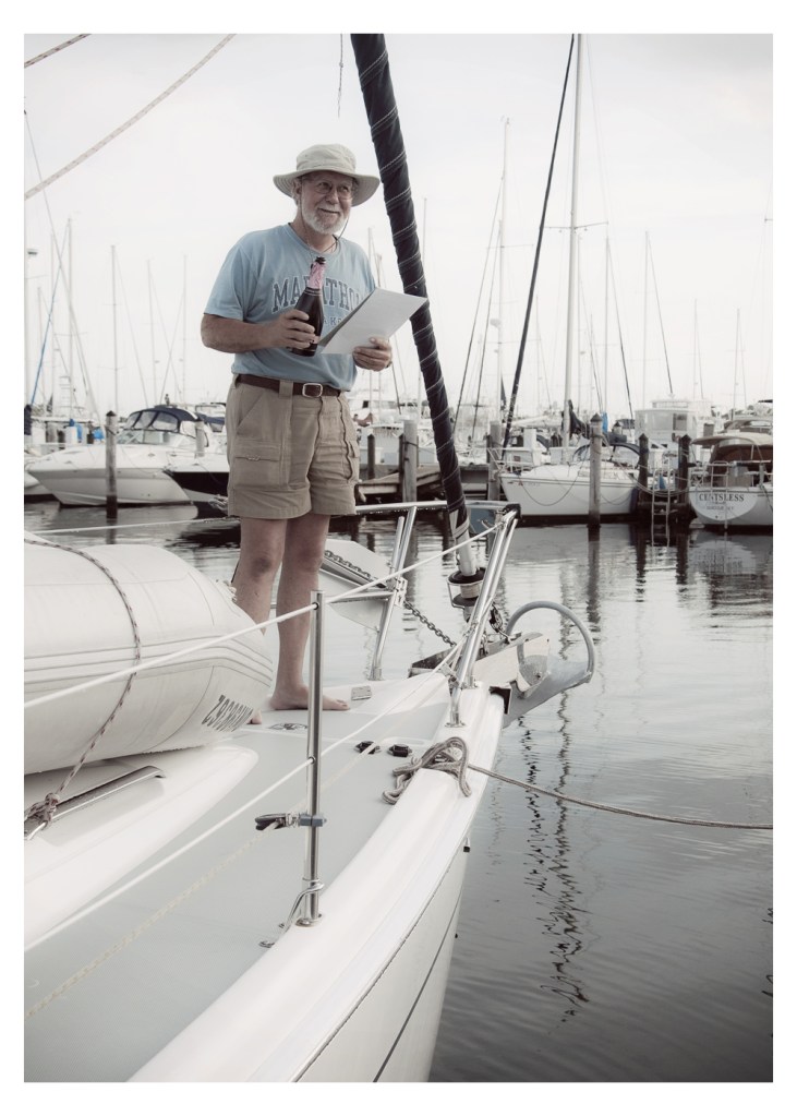 Then: “Today we come to name this sailboat Windsong II, and send her to sea to be cared for, and to care for the Galey-Hussey family. We ask the sailors of old and the mood of God that is the sea to accept Windsong II as her name, to help her through her passages, and allow her to return with her crew safely. (Again, we raised our glasses and said, “To the sea…to the sailors before us…to Windsong II.” A long, last sip.)