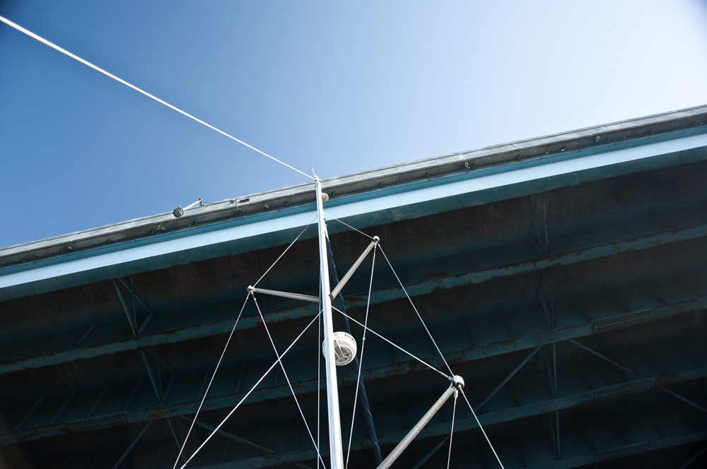 I was looking up when we went through and saw something on the top of our mast hit the bridge and fly off in pieces. I was afraid it was our antenna. That would have left us without a good VHF radio. (We have a handheld one that we can use in a pinch.) But it turned out to be our anchor light. Bob tells me we have an extra one and is threatening to send me up the mast to replace it. Such a funny man!