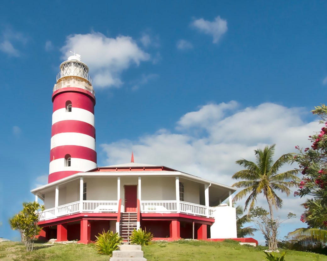 The strip of land behind it is the little settlement of Hopetown. Neither cars nor golf carts are allowed in the town but you can travel throughout the rest of the cay using golf carts.