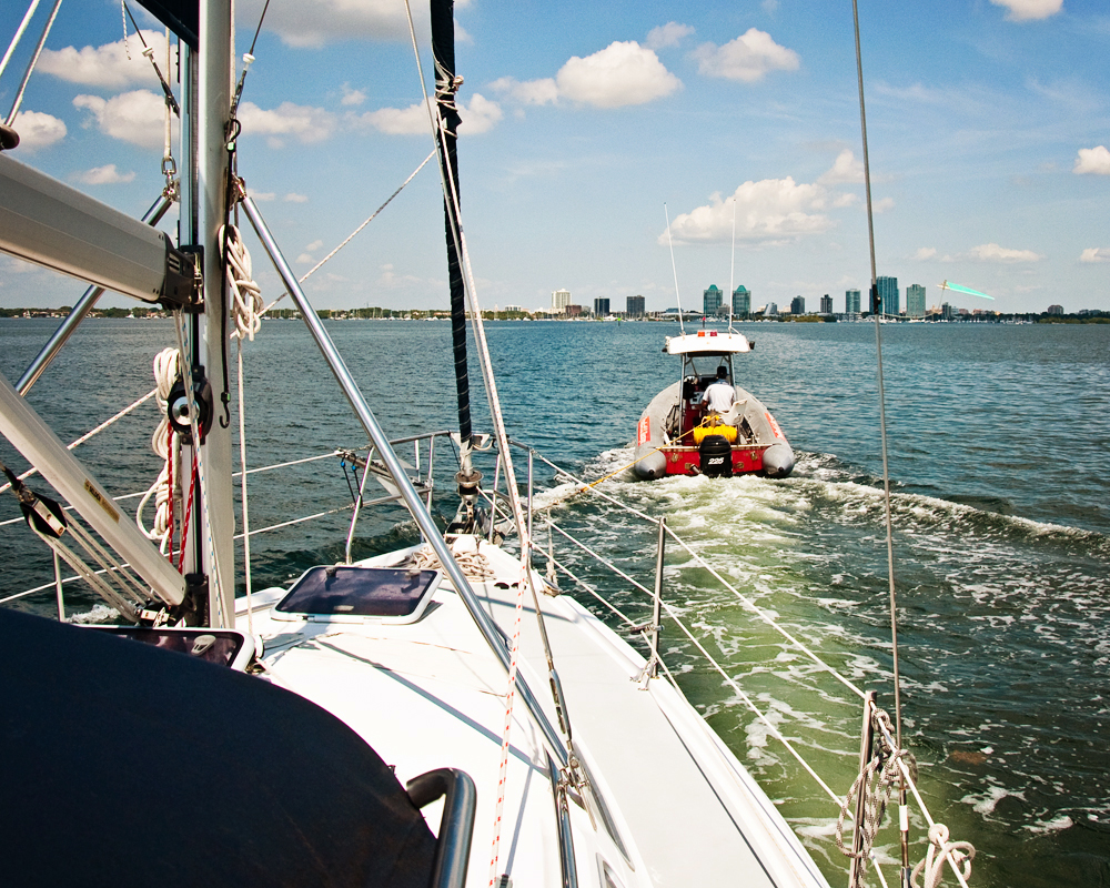 We didn’t hesitate to call Boat U.S., and, within 45 minutes, Matt showed up with his tow boat to rescue us. You could tell that he had done this many many times before and his professionalism certainly inspired confidence. First, we tried booster cables, but the batteries were totally fried. A tow it was to  be. Matt tied us on to his boat with a line and proceeded to lead us back to Dinner Key.