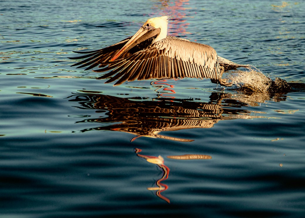 Brown Pelicans are the only type that feed by plunging into the water, stunning small fish with the impact of their large bodies and scooping them up in their expandable throat pouches.